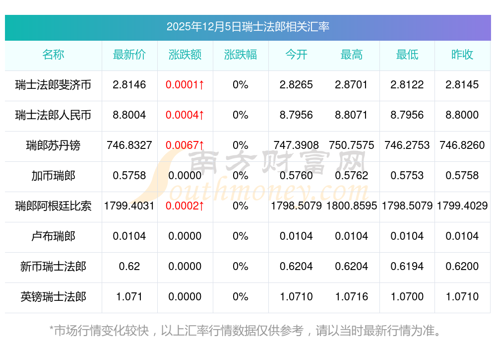 2025年12月5日瑞士法郎相關(guān)匯率查詢