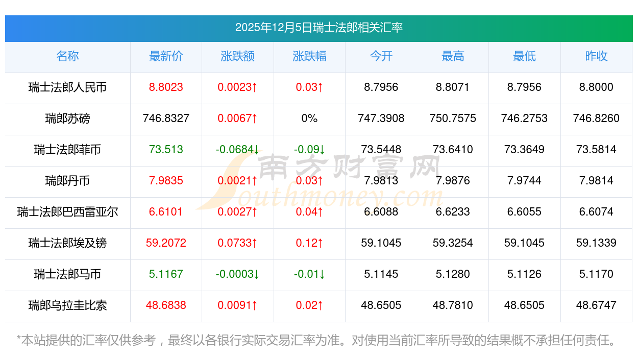 2025年12月5日瑞士法郎相關(guān)匯率查詢