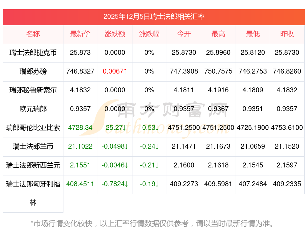 今天瑞士法郎對利幣匯率一表2025/12/05