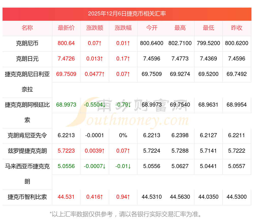 2025年12月6日最新消息,捷克幣兌換菲幣最新匯率為2.835900,今開為2.8359,昨收為2.8359,最高為2.8465,最低為2.8333。