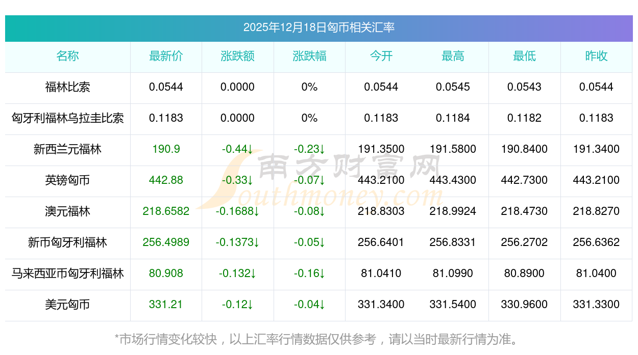 根據(jù)2025年12月18日匯率計(jì)算,HUF兌換COP匯率最新價11.645400,今開價11.6680,昨收價11.6681,最高價11.6776,最低價11.6306。