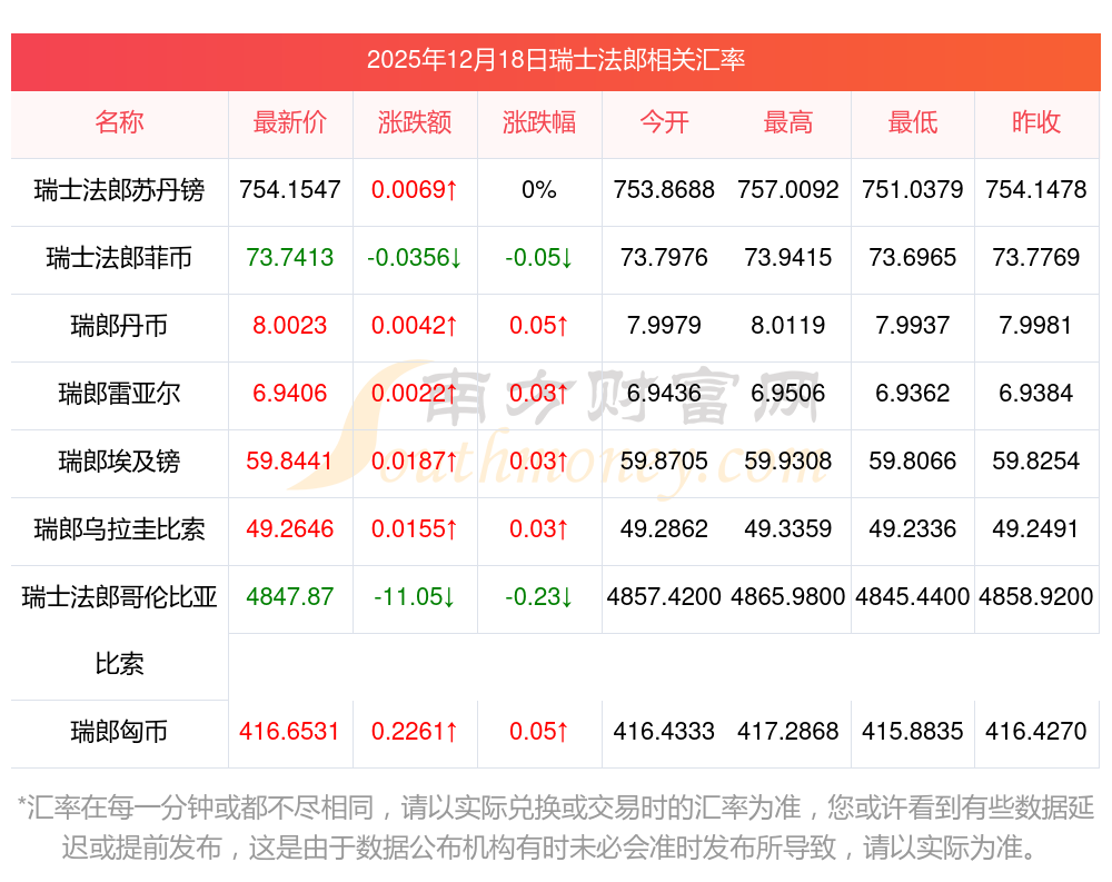 2025年12月18日瑞士法郎相關(guān)匯率查詢