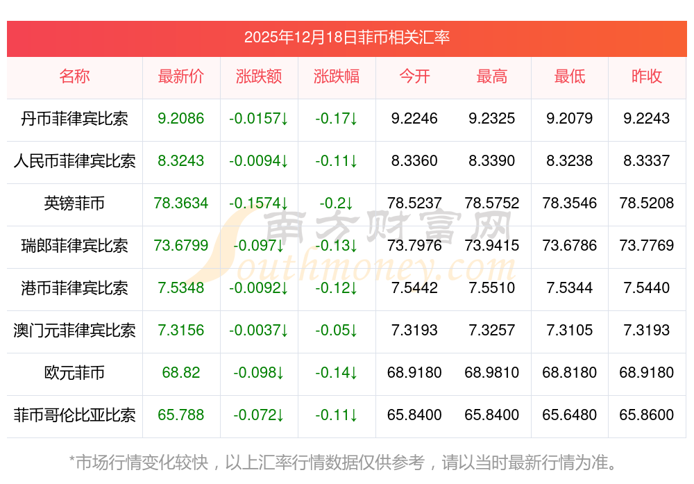 2025年12月18日最新消息,菲幣兌換埃鎊最新匯率為0.811700,今開為0.8107,昨收為0.8109,最高為0.8122,最低為0.8104。