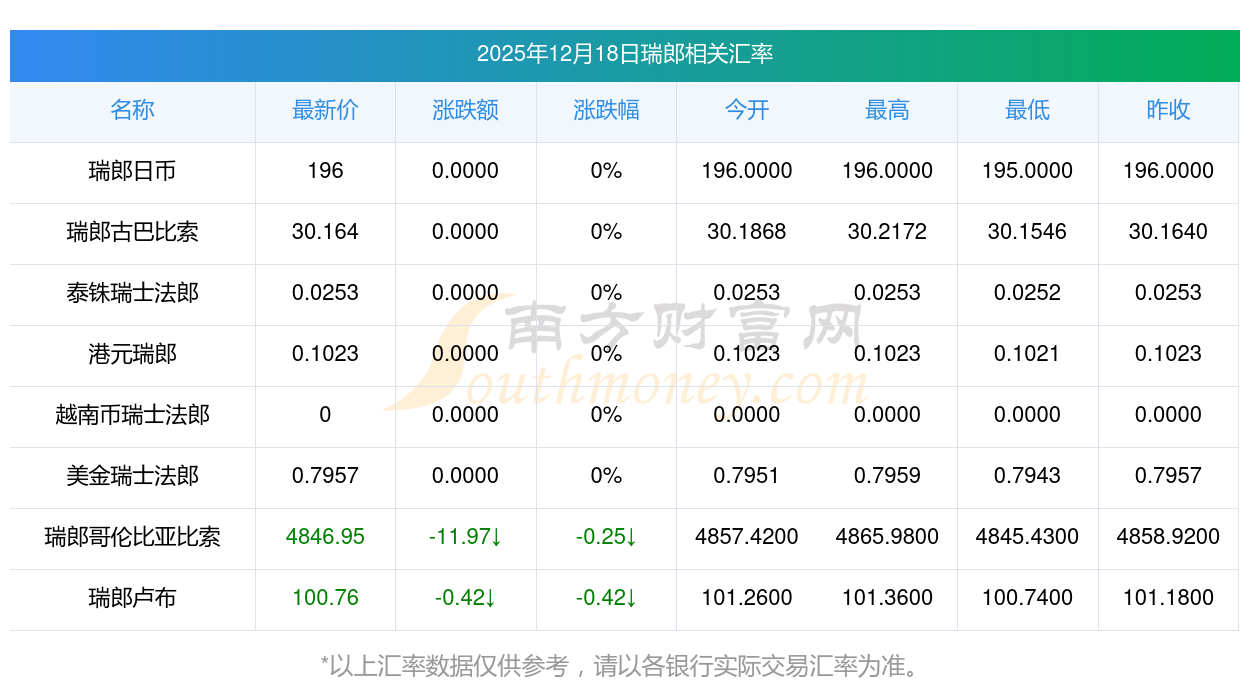 2025年12月18日瑞郎相關(guān)匯率查詢