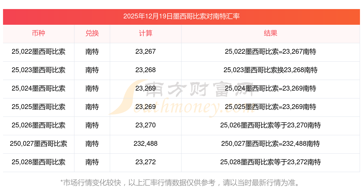 最新墨西哥比索對南特匯率查詢一覽表2025年12月19日