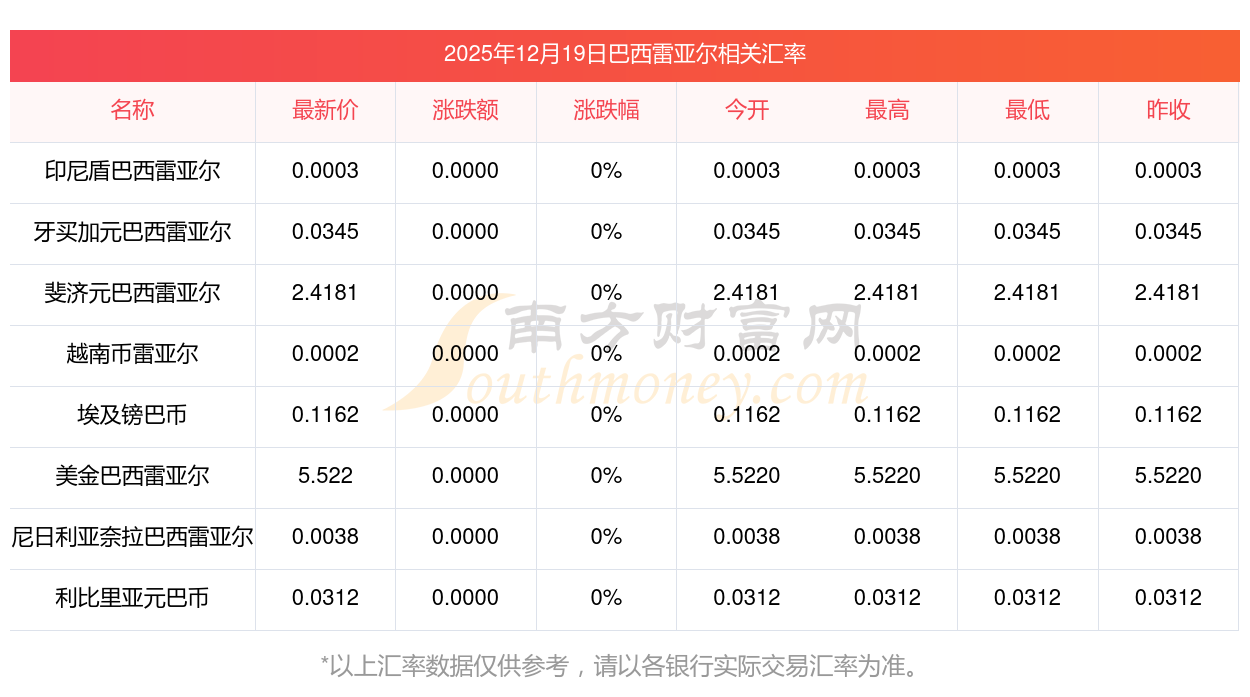 2025年12月19日巴西雷亞爾相關(guān)匯率查詢