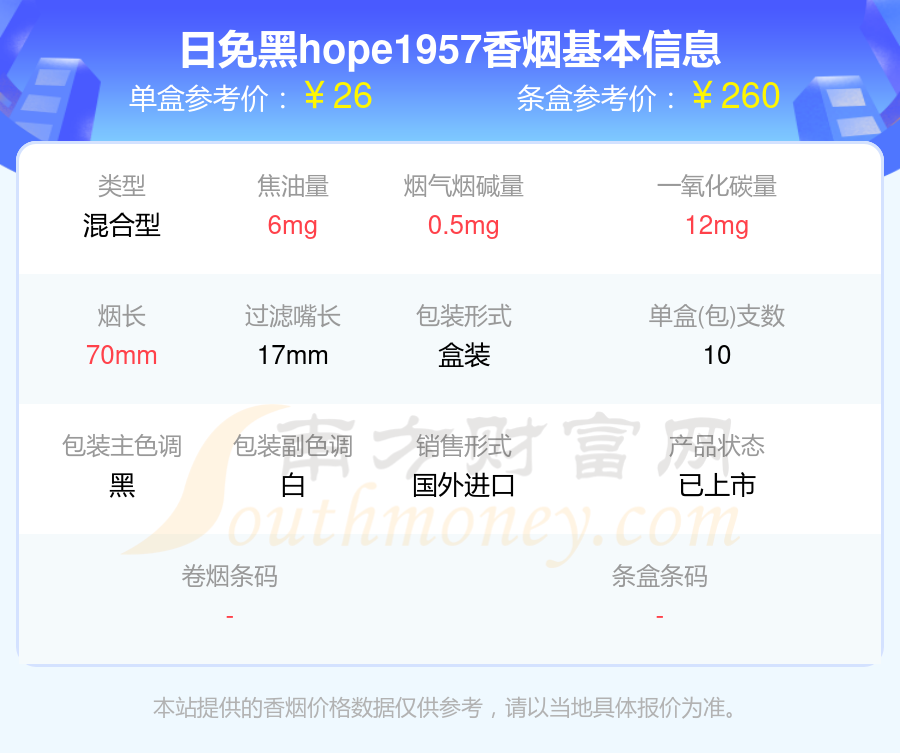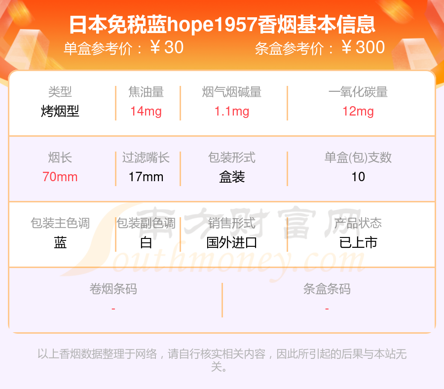 HOPE香煙煙堿量1.5mg以下的煙有哪些?擇煙網(wǎng)為大家整理提供,分別有:日本免稅藍(lán)hope1957、HOPE(藍(lán))10支裝日本免稅出口版、日免黑hope1957等,具體價(jià)格如下: