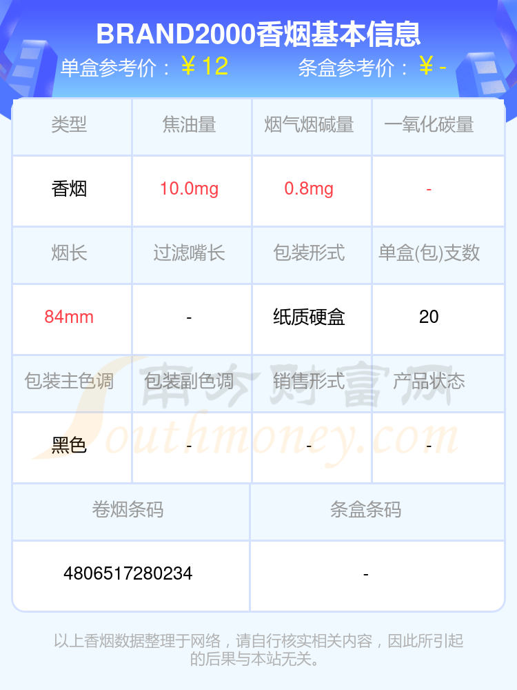 尼古丁量1.5mg以下的BRAND2000香煙有哪些?擇煙網(wǎng)為大家整理盤點,分別有:BRAND2000、BRAND2000等,具體價格如下: