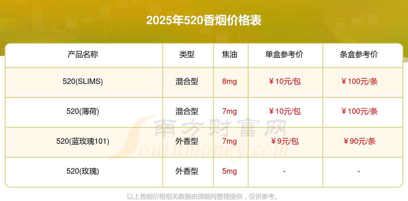 2025520香煙最新價格:520(薄荷)參考價10.0元/包、520(SLIMS)參考價10.0元/包、520(藍(lán)玫瑰101)參考價9.0元/包。