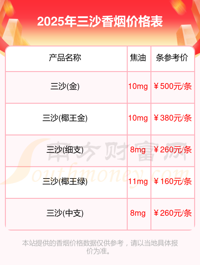 2025年三沙香煙三沙(金)、三沙(椰王金)、三沙(細(xì)支)、三沙(中支)、三沙(椰王綠)等最新價(jià)格如下:三沙(金)參考價(jià)50.0元/包、三沙(椰王金)參考價(jià)38.0元/包、三沙(細(xì)支)參考價(jià)26.0元/包、三沙(中支)參考價(jià)26.0元/包、三沙(椰王綠)參考價(jià)16.0元/包。