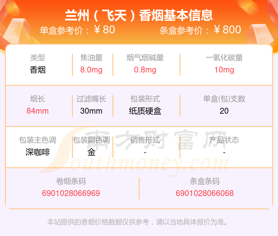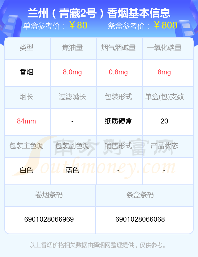 蘭州香煙80至90元左右的煙有蘭州(青藏2號)、蘭州(飛天)等,詳細價格如下: