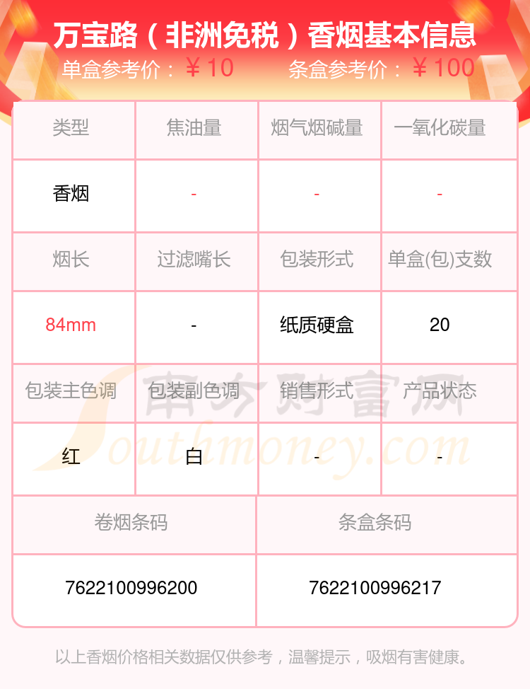 Marlboro(萬寶路)香煙低于10元的煙分別有萬寶路(紅中免)參考價(jià)9.0元/包、萬寶路(紅免稅阿拉伯版)參考價(jià)9.0元/包、萬寶路(白越版)參考價(jià)9.0元/包、萬寶路(馬來西亞免稅白)參考價(jià)9.0元/包、萬寶路(亞太免稅中醇)參考價(jià)10.0元/包、萬寶路(薄荷中國(guó)免稅)參考價(jià)10.0元/包、萬寶路(白免稅GCC版)參考價(jià)10.0元/包、萬寶路(軟特醇美國(guó)免稅版)參考價(jià)10.0元/包、萬寶路(軟薄荷特醇菲律賓版)參考價(jià)10.0元/包、萬寶路(非洲免稅)參考價(jià)10.0元/包等。