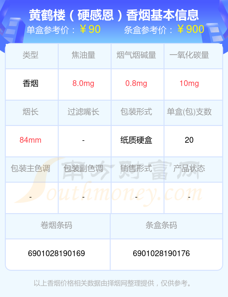 黃鶴樓(夏·品道軟)參考價90.0元/包、黃鶴樓(冬·品道硬)參考價90.0元/包、黃鶴樓(硬天驕?zhǔn)サ兀﹨⒖純r90.0元/包、黃鶴樓(正道)參考價90.0元/包、黃鶴樓(硬感恩)舊版參考價90.0元/包、黃鶴樓(硬感恩)參考價90.0元/包、黃鶴樓(硬長漫天游)參考價85.0元/包、黃鶴樓(軟漫天游)參考價85.0元/包、黃鶴樓(喜相逢·福)參考價80.0元/包、黃鶴樓(喜相逢·金玫瑰)參考價80.0元/包等。