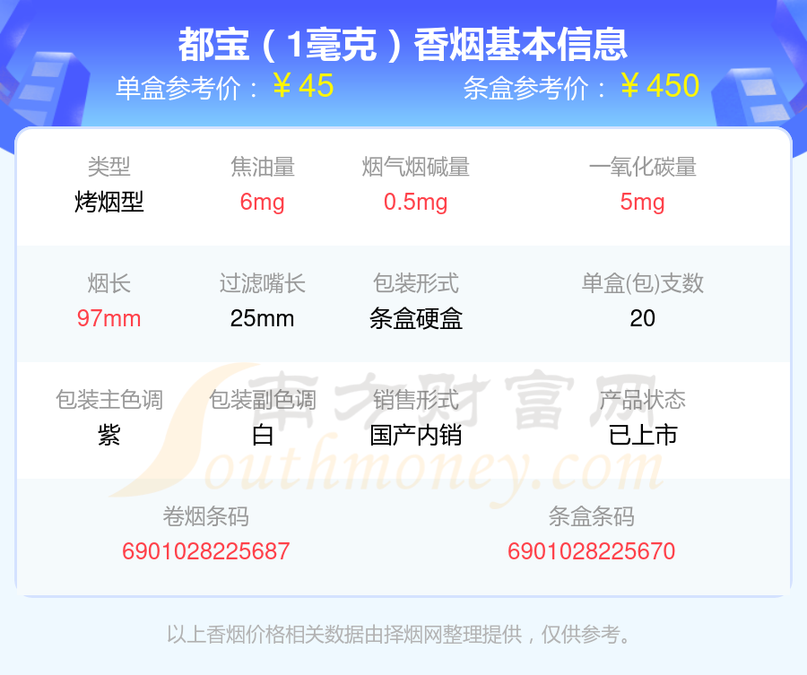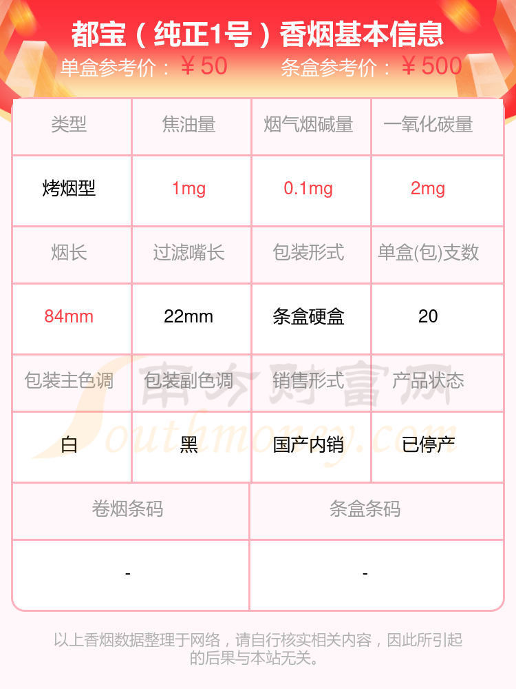 都寶香煙40-80元左右的煙有都寶(純正1號)、都寶(1毫克)等,具體價格如下: