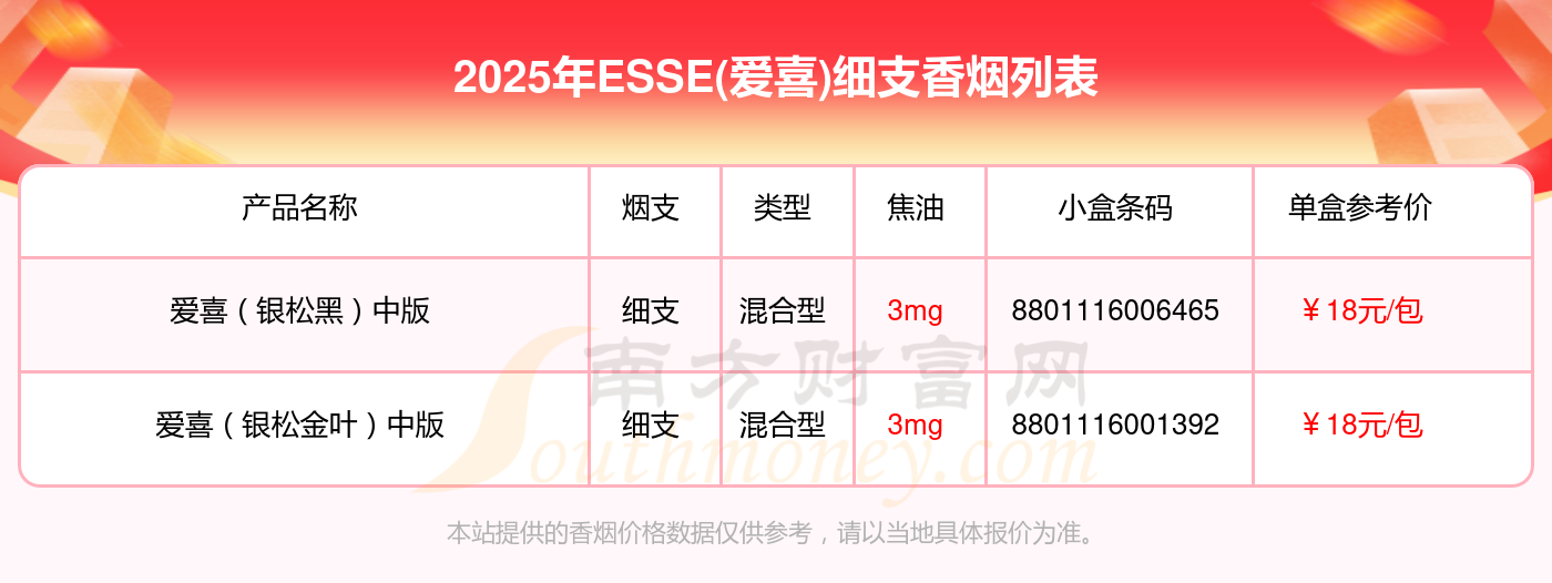 擇煙網(wǎng)為大家盤點(diǎn)了ESSE(愛喜)香煙細(xì)支的,分別有愛喜(銀松黑)中版、愛喜(銀松金葉)中版等,詳細(xì)價(jià)格如下: