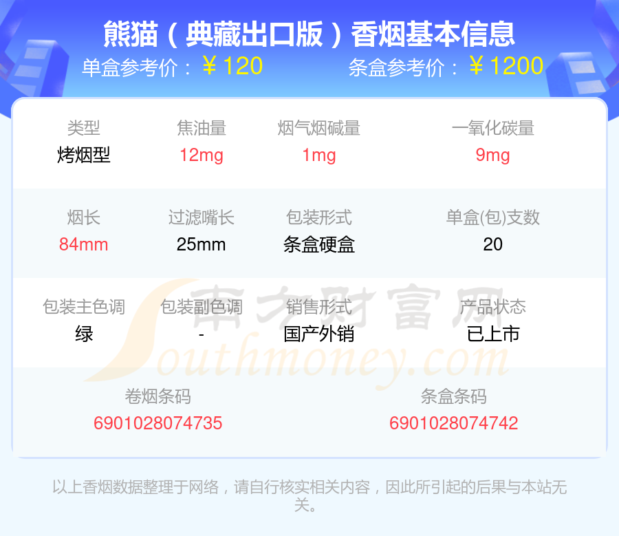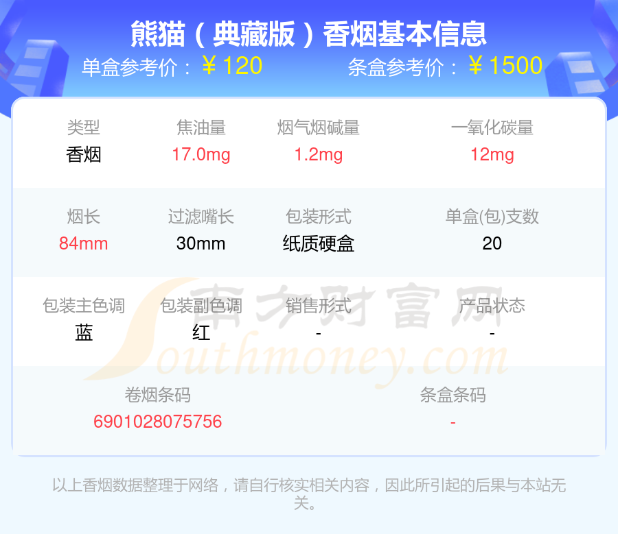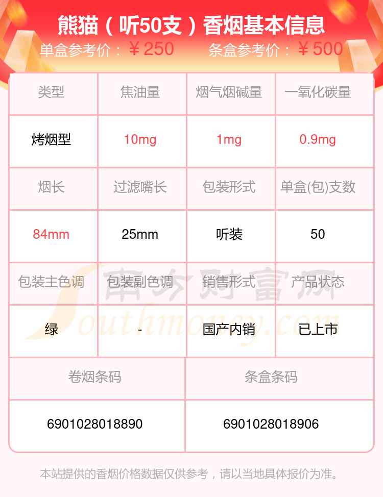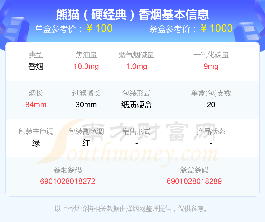 熊貓(硬時(shí)代版)參考價(jià)85.0元/包、熊貓(硬時(shí)代)參考價(jià)85元/包、熊貓(聽50支)參考價(jià)250元/包、熊貓(典藏版)參考價(jià)120.0元/包、熊貓(典藏出口版)參考價(jià)120元/包、熊貓(硬經(jīng)典)參考價(jià)100.0元/包等。