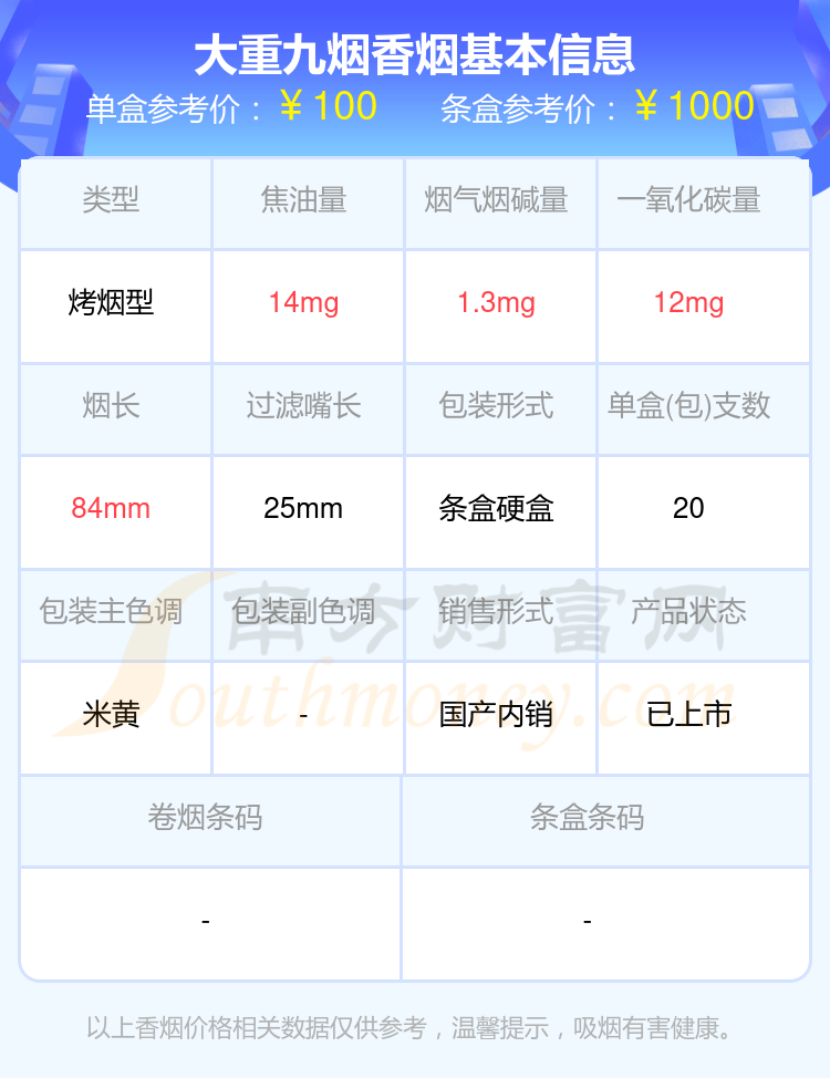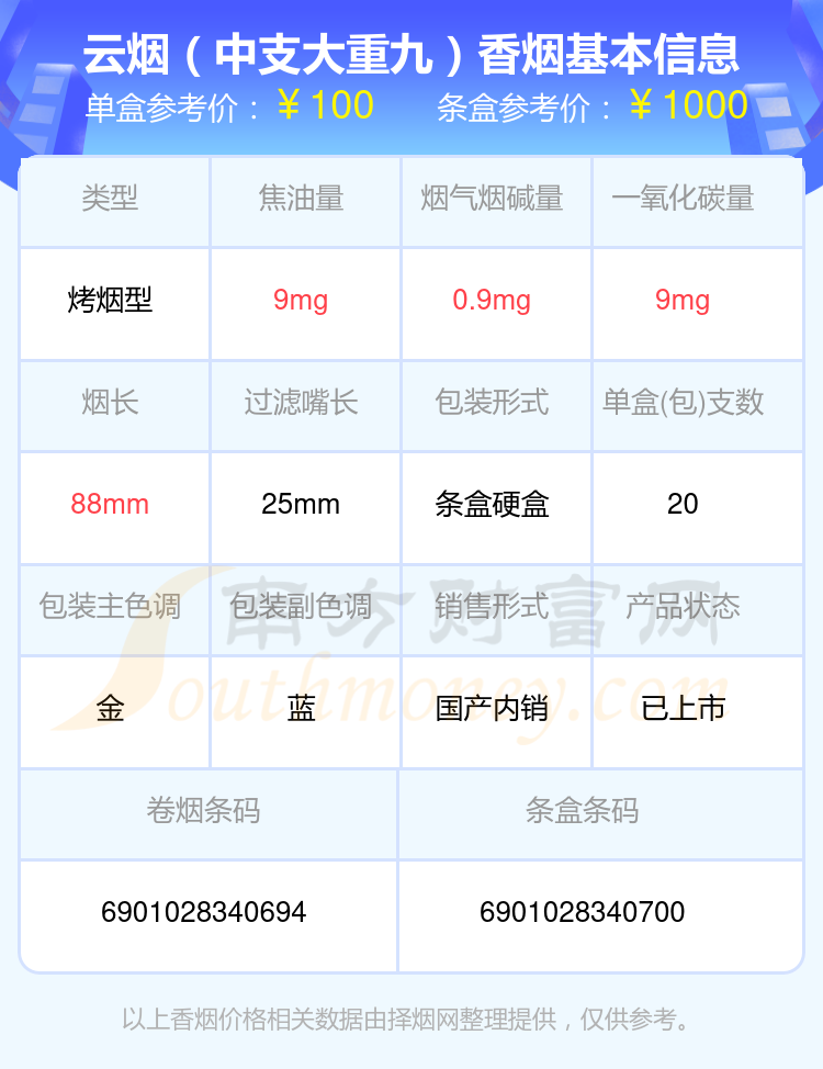 大重九煙參考價100元/包、大重九(藍盾出口)參考價5元/包、云煙(中支大重九)參考價100元/包、大重九(鐵盒)參考價100元/包等。