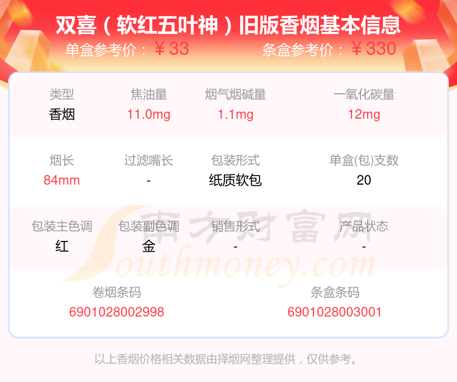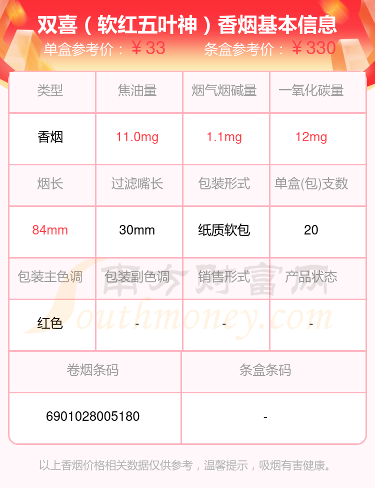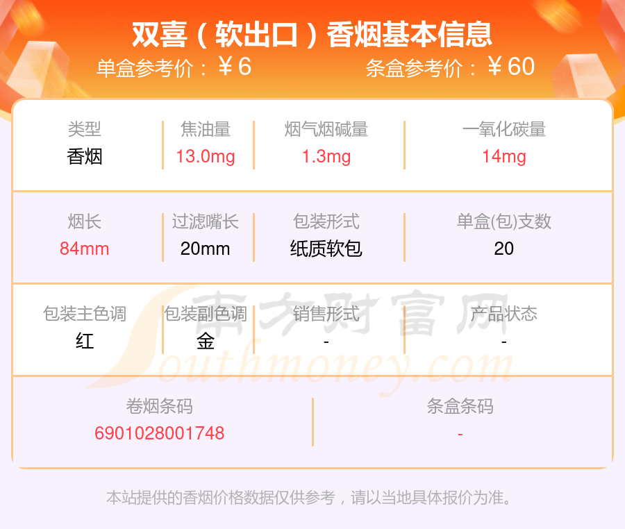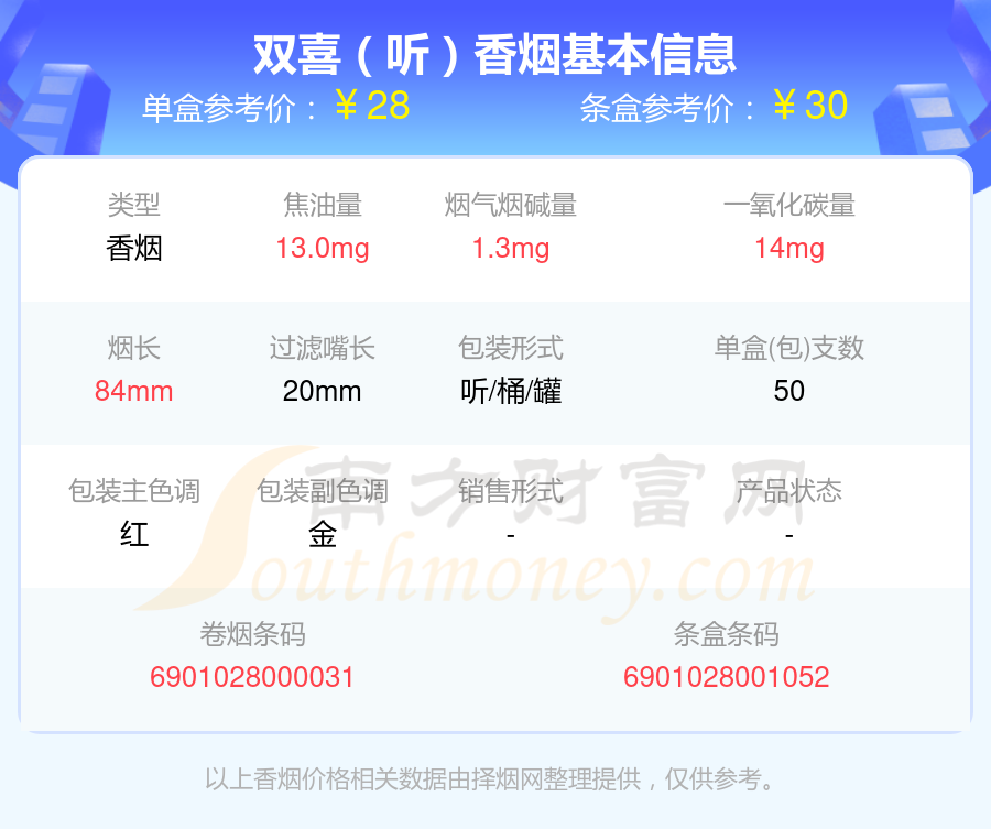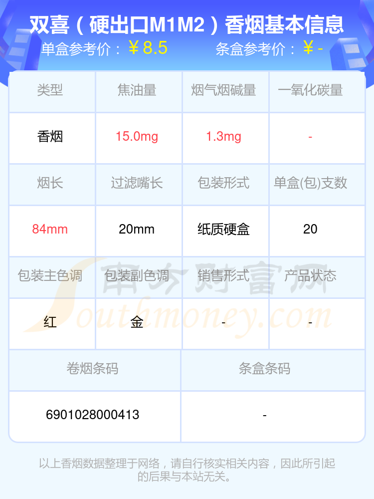 雙喜(軟出口)參考價(jià)6.0元/包、雙喜(聽)參考價(jià)28.0元/包、雙喜(硬出口M1M2)參考價(jià)8.5元/包、雙喜(硬出口)參考價(jià)7.0元/包、雙喜(硬)參考價(jià)8.0元/包、雙喜(軟01)參考價(jià)12.0元/包、雙喜(硬01)參考價(jià)12.0元/包、雙喜(軟)參考價(jià)11.0元/包、雙喜(軟紅五葉神)舊版參考價(jià)33.0元/包、雙喜(軟紅五葉神)參考價(jià)33.0元/包等。
