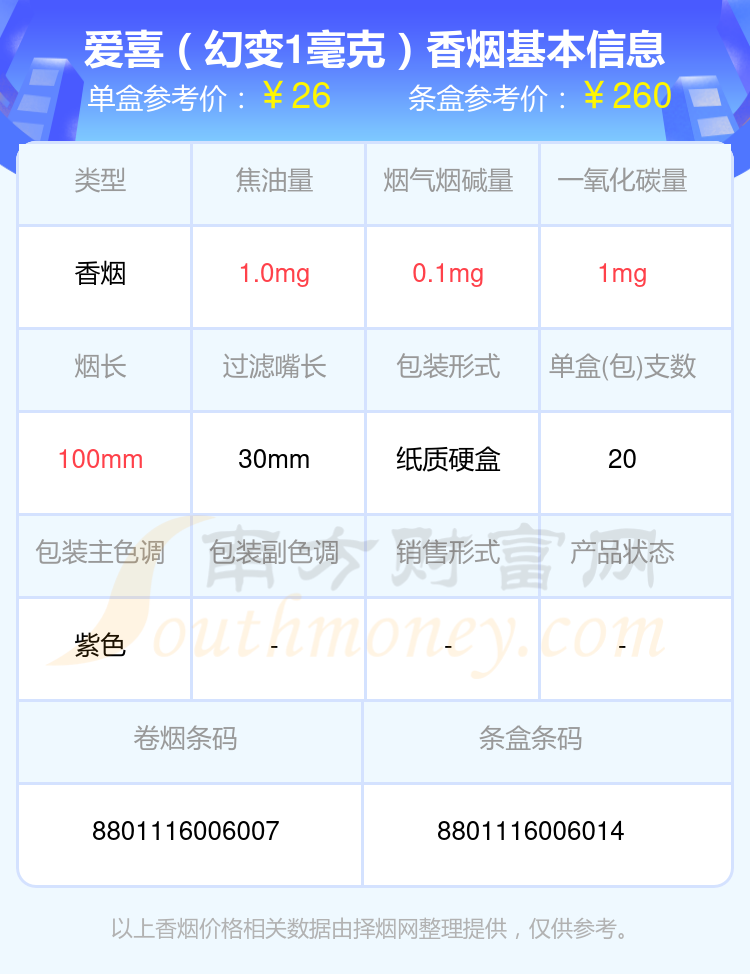 擇煙網(wǎng)為大家盤點(diǎn)了20元至30元左右的ESSE(愛喜)香煙,分別有愛喜(幻變1毫克)參考價26.0元/包、愛喜(幻變)舊版參考價23.0元/包等。