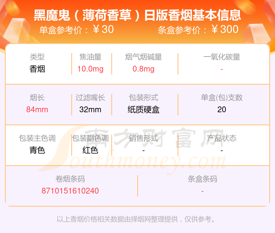 擇煙網(wǎng)為大家盤點(diǎn)了30-50元的BLACK DEVIL(黑魔鬼)香煙,有黑魔鬼(可可)日版、黑魔鬼(北極薄荷)日版、黑魔鬼(摩卡香草)日版、黑魔鬼(薄荷香草)日版等,詳細(xì)價(jià)格如下: