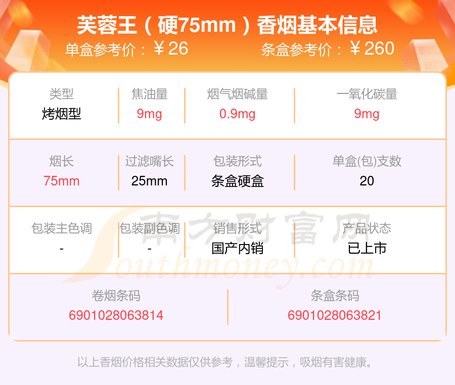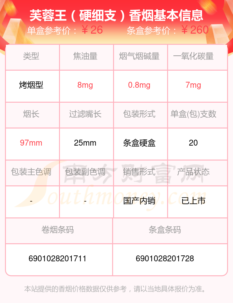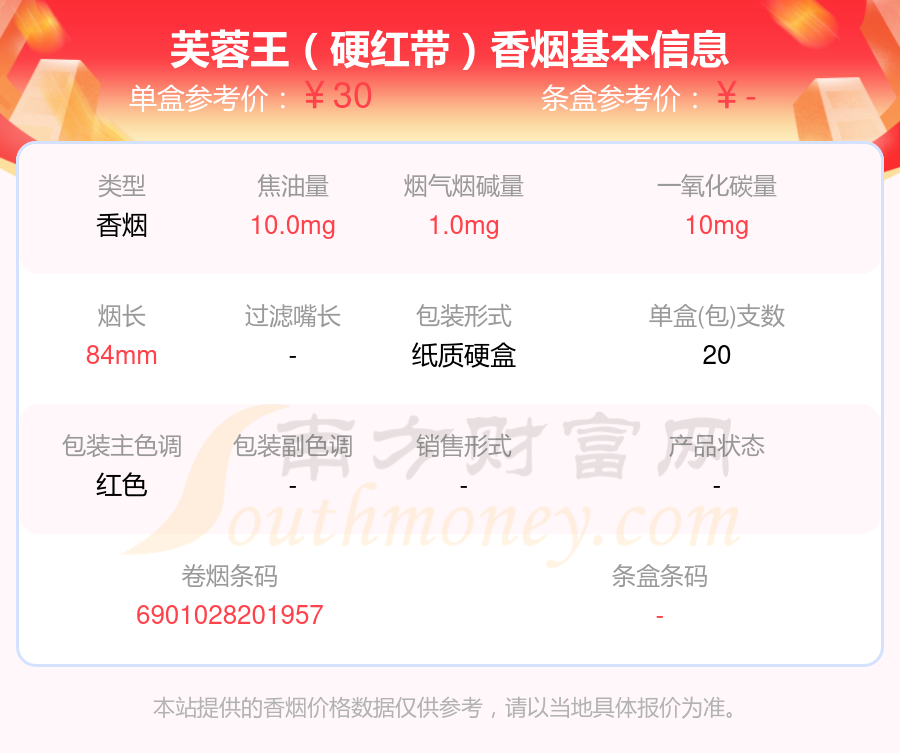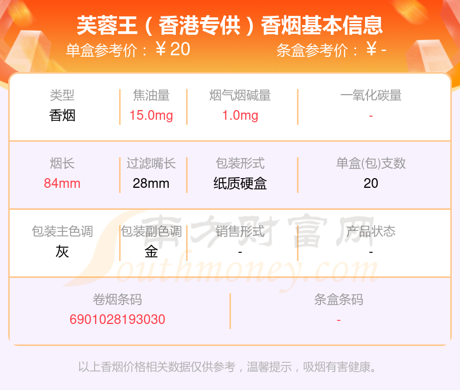 芙蓉王(硬紅帶)參考價30.0元/包、芙蓉王(硬紅帶細支)參考價30.0元/包、芙蓉王(硬中支)參考價30.0元/包、芙蓉王(硬新版)參考價30元/包、芙蓉王(硬細支)參考價26元/包、芙蓉王(硬75mm)參考價26元/包、芙蓉王(硬)參考價25.0元/包、芙蓉王(張家界)參考價25元/包、芙蓉王(香港免稅)參考價20.0元/包、芙蓉王(香港專供)參考價20.0元/包等。