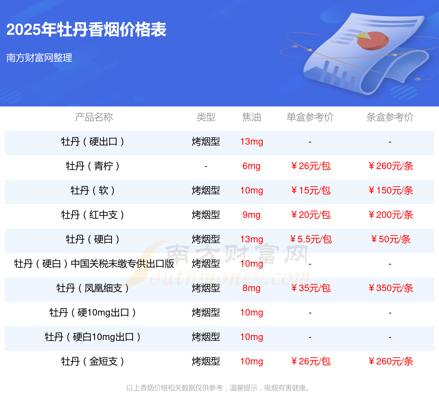 1919年上海振勝煙廠推出“牡丹”牌卷煙。1929年,振勝煙廠被英美煙公司收購(gòu),“牡丹”牌(包括“白牡丹”牌)卷煙成為大達(dá)煙廠的產(chǎn)品。1956年,上海卷煙二廠重新開發(fā)生產(chǎn)“牡丹”牌卷煙!澳档ぁ迸凭頍熢1979年,1983年兩次評(píng)為全國(guó)輕工業(yè)部?jī)?yōu)質(zhì)產(chǎn)品,1985年獲名牌產(chǎn)品“金牛獎(jiǎng)”,1987年和1990年兩度被評(píng)為全國(guó)煙草暢銷牌號(hào)。