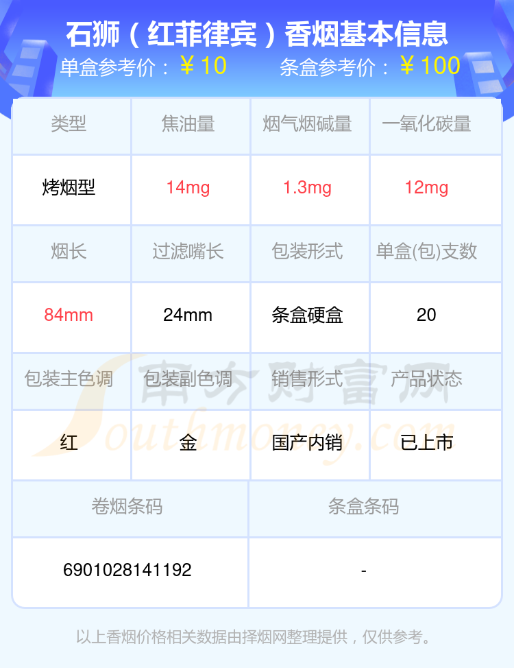 擇煙網(wǎng)為大家盤點(diǎn)了煙堿量1mg~2mg的石獅香煙,有石獅(軟吉祥)、石獅(紅菲律賓)、石獅(新)、石獅(藍(lán)菲律賓)、石獅(平安菲律賓)、石獅(喜獅)、石獅(軟富。、石獅(沉香)、石獅(軟吉慶)、石獅(平安)等,詳細(xì)價(jià)格如下: