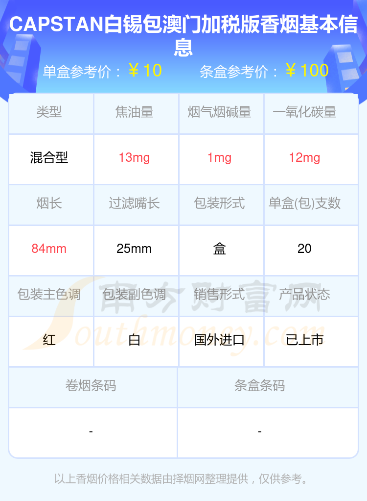 萬寶路(硬紅中免)參考價9元/包、CAPSTAN白錫包澳門加稅版參考價10元/包、CAPSTAN參考價8元/包等。
