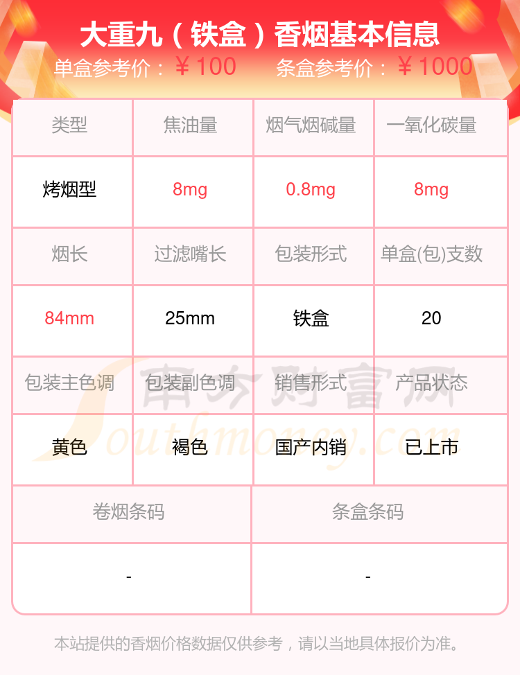 焦油量8~15mg的大重九香煙有哪些?擇煙網(wǎng)為大家整理盤點,有云煙(中支大重九)、大重九(鐵盒)、大重九煙、大重九(藍盾出口)等,詳細價格如下: