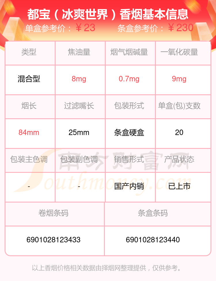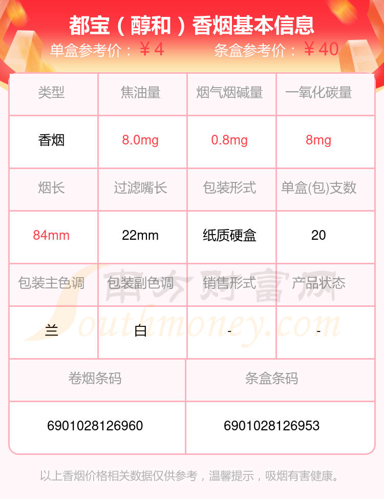 都寶香煙焦油量低于10mg的煙分別有都寶(9mg)參考價(jià)5.0元/包、都寶(16支醇和)參考價(jià)3.0元/包、都寶(醇和)參考價(jià)4.0元/包、都寶(8mg)參考價(jià)10.0元/包、都寶(新)參考價(jià)6.0元/包、都寶(冰爽世界)參考價(jià)23元/包、都寶(睿雅鉑金)參考價(jià)10元/包、都寶(榮耀黃金)參考價(jià)10元/包、都寶(16支純和)參考價(jià)3元/包、都寶(銀時(shí)尚)參考價(jià)6.0元/包等。