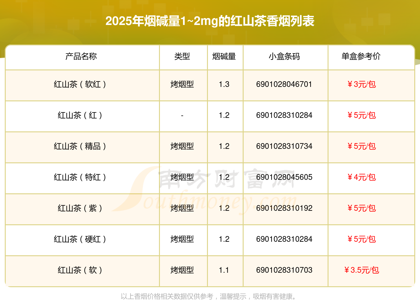 擇煙網為大家盤點了紅山茶香煙煙堿量1~2mg的,分別有紅山茶(軟紅)、紅山茶(紅)、紅山茶(精品)、紅山茶(特紅)、紅山茶(紫)、紅山茶(硬紅)、紅山茶(軟)等,詳細價格如下: