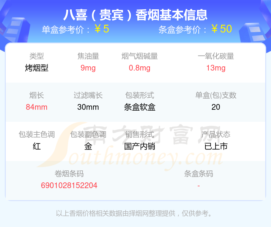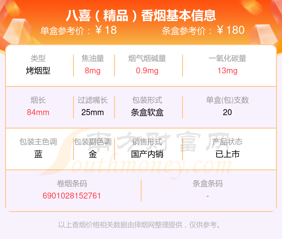 八喜香煙尼古丁低于4mg的煙有八喜(東方)、八喜(富貴)、八喜(精品)、八喜(貴賓)等,具體價(jià)格如下: