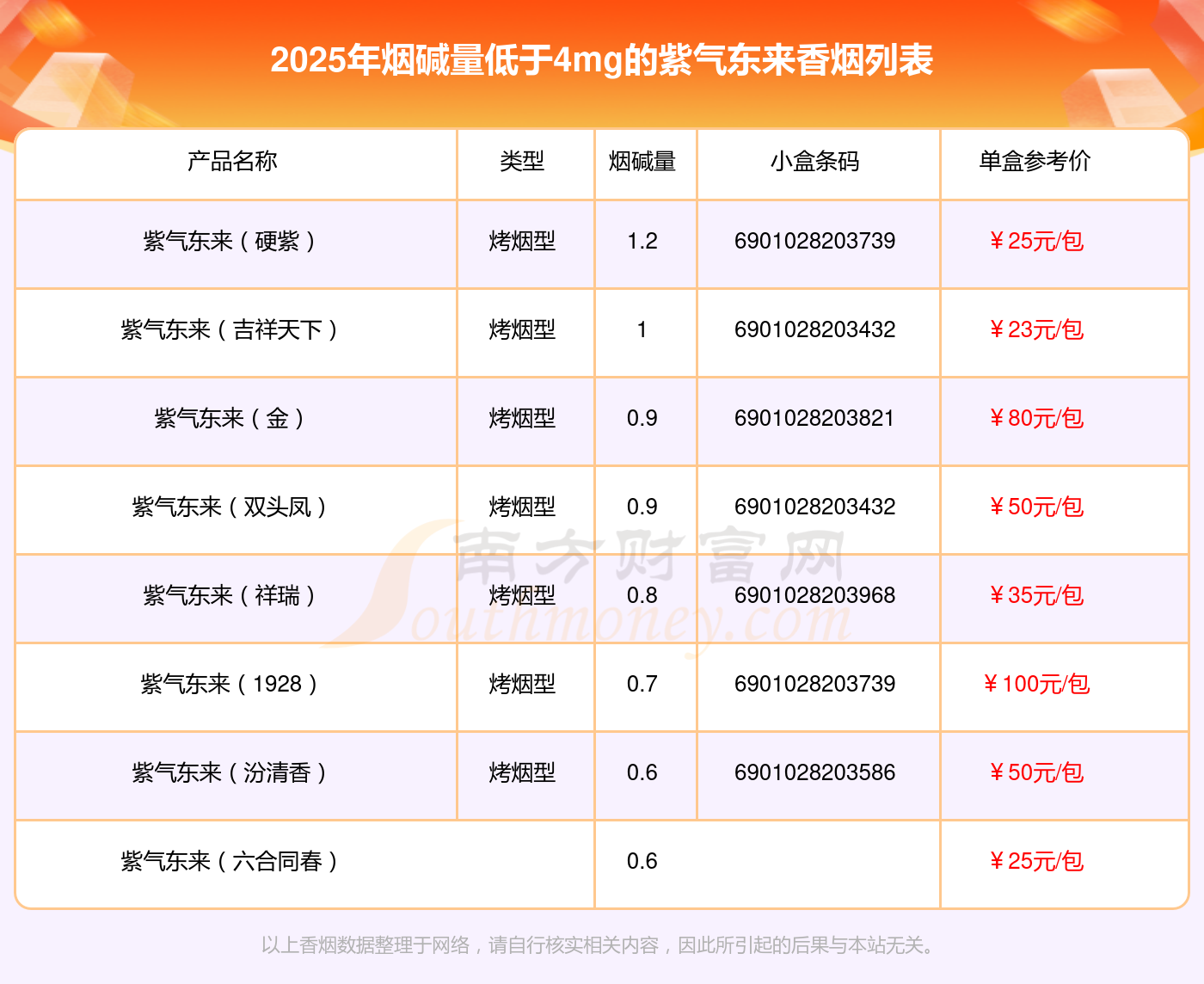 擇煙網(wǎng)為大家盤點了紫氣東來香煙煙堿量低于4mg的煙,有以下這些: