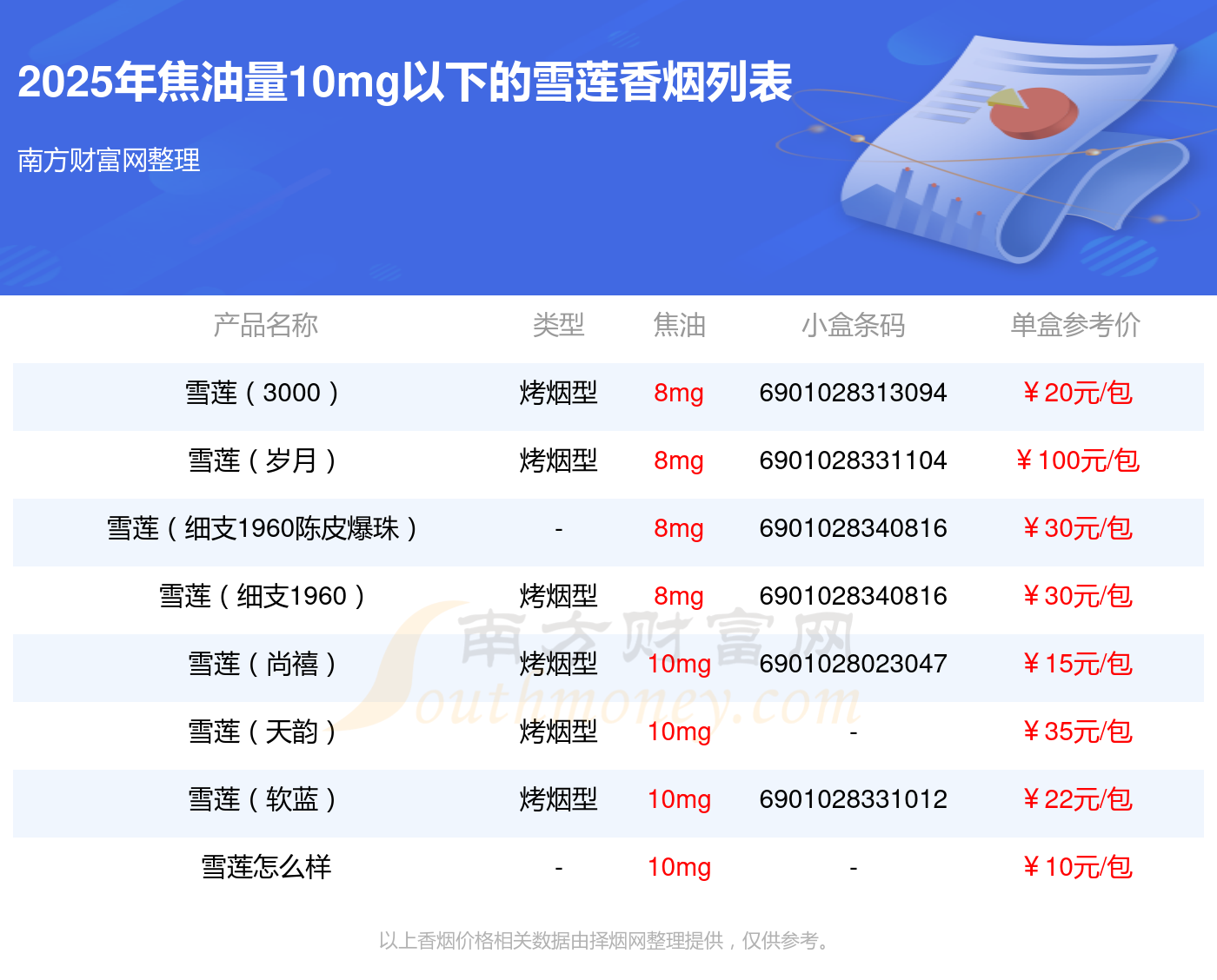 擇煙網(wǎng)為大家盤(pán)點(diǎn)了雪蓮香煙焦油量10mg以下的,分別有雪蓮(3000)、雪蓮(歲月)、雪蓮(細(xì)支1960陳皮爆珠)、雪蓮(細(xì)支1960)、雪蓮(尚禧)、雪蓮(天韻)、雪蓮(軟藍(lán))、雪蓮怎么樣等,具體價(jià)格如下: