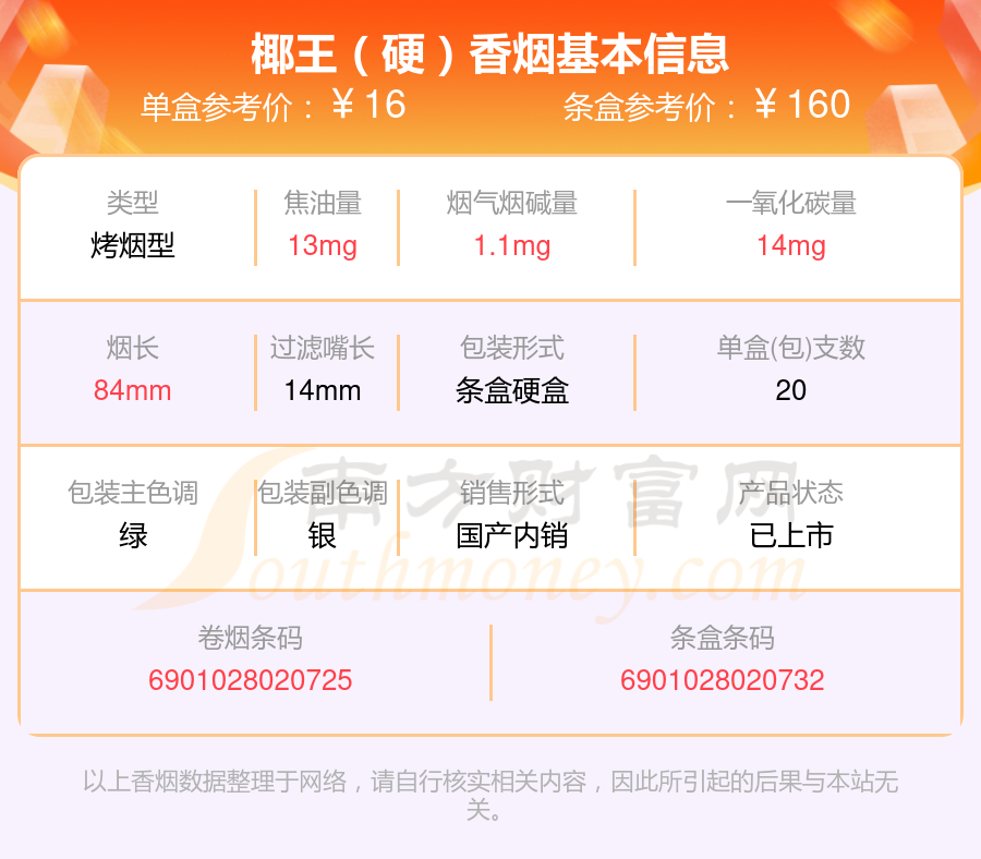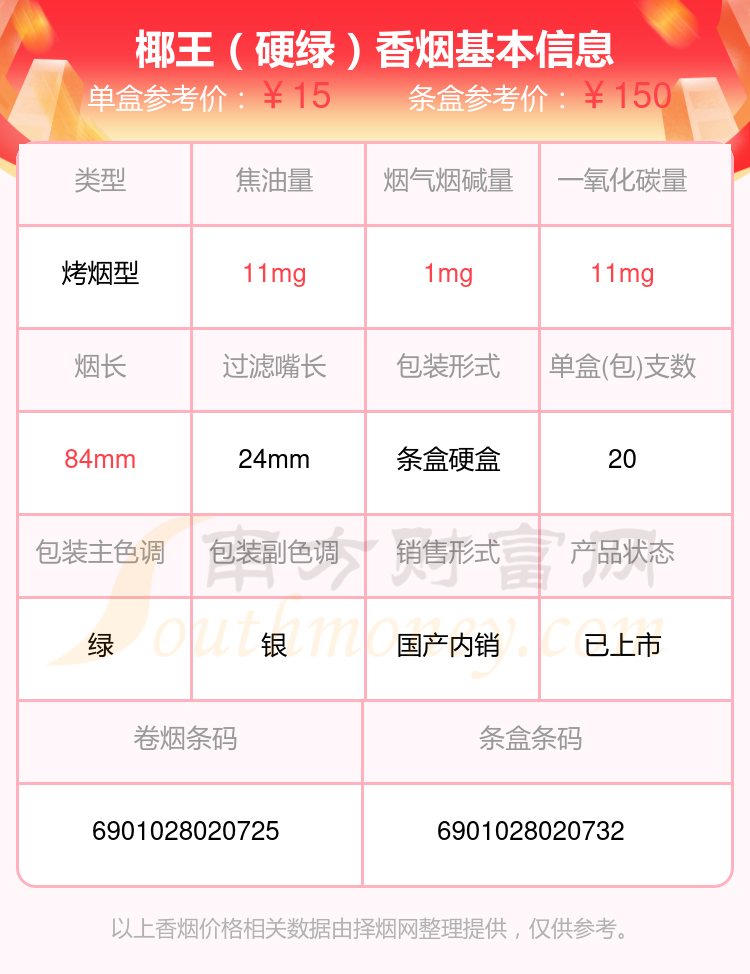 椰王香煙煙堿4mg以下的煙有椰王(硬)、椰王(硬綠)、椰王(硬金)等,具體價格如下: