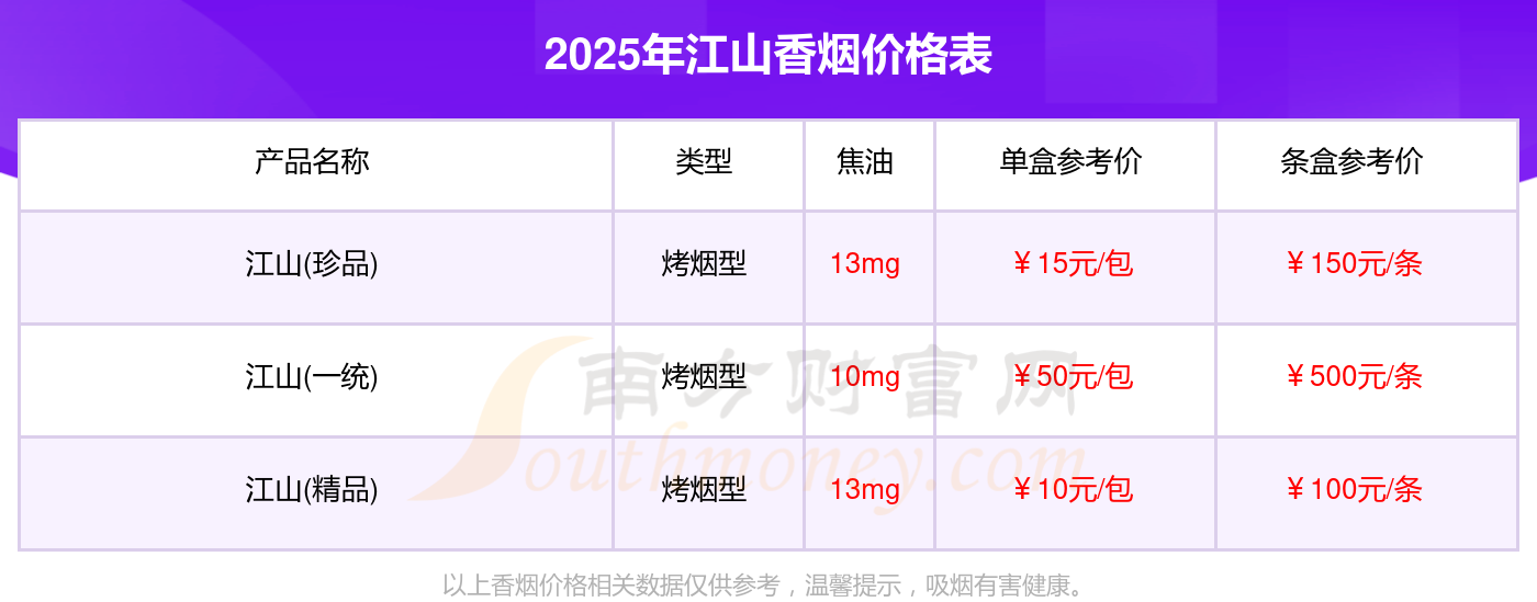 2025江山香煙最新價(jià)格:江山(一統(tǒng))參考價(jià)50.0元/包、江山(珍品)參考價(jià)15.0元/包、江山(精品)參考價(jià)10.0元/包。