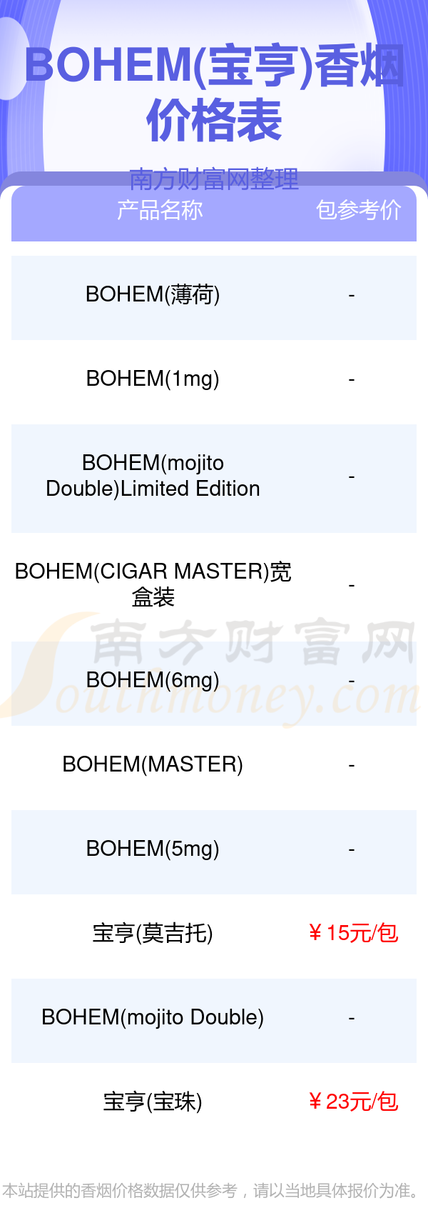 當(dāng)下BOHEM(寶亨)價格最高的香煙為寶亨(寶珠),參考價23.0元/包,而BOHEM(寶亨)香煙價格最低的是寶亨(莫吉托),參考價15.0元/包,價格高低差為8元/包。
