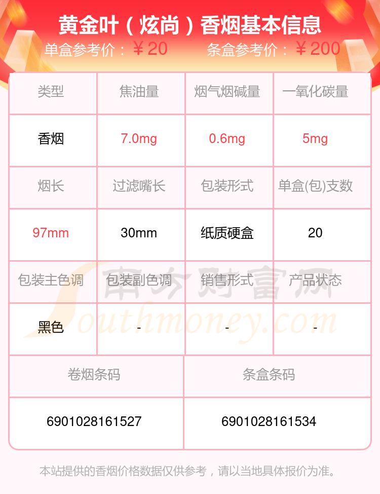 黃金葉香煙十至二十元左右的煙有黃金葉(黑商鼎)、黃金葉(昆香)、黃金葉(群英會)、黃金葉(商鼎)、黃金葉(易捷至臻)、黃金葉(許昌水韻蓮城)、黃金葉(豫煙2號)、黃金葉(炫尚)、黃金葉(帝豪·一代天驕)、黃金葉(大紅南陽)等,具體價格如下: