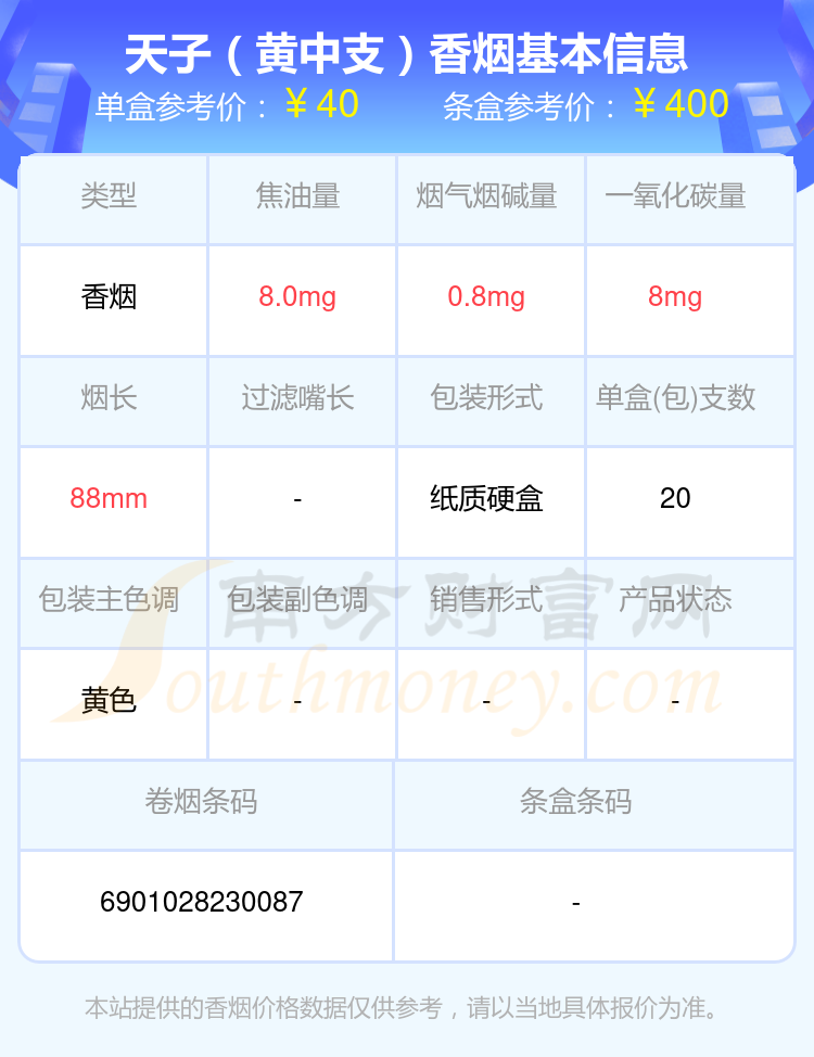 天子香煙焦油量低于10mg的煙有天子(中國心中支)、天子(重慶印象)、天子(觀天下長嘴中支)、天子(千里江山中支)、天子(觀天下)、天子(黃中支)、天子(千里江山細支)、天子(黃 寬版)、天子(硬黃)、天子(黃)等,詳細價格如下: