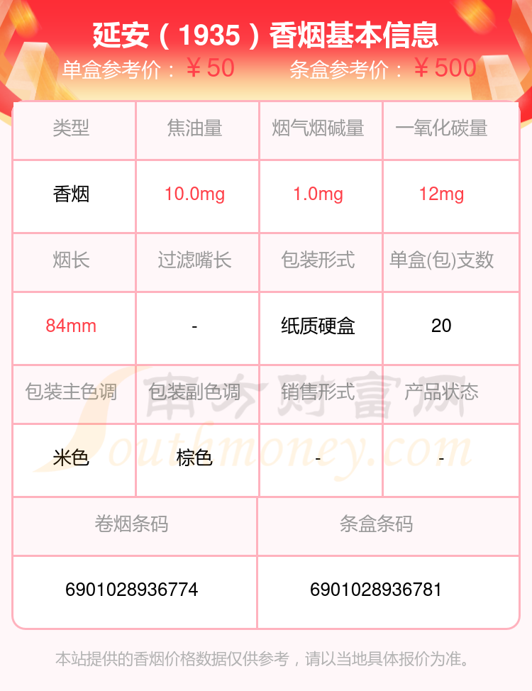 延安香煙五十元到八十元的煙有延安(千年帝都)、延安(千年帝都中支)、延安(細支1935)、延安(1935)、延安(中支1935)、延安(1935中支)等,詳細價格如下: