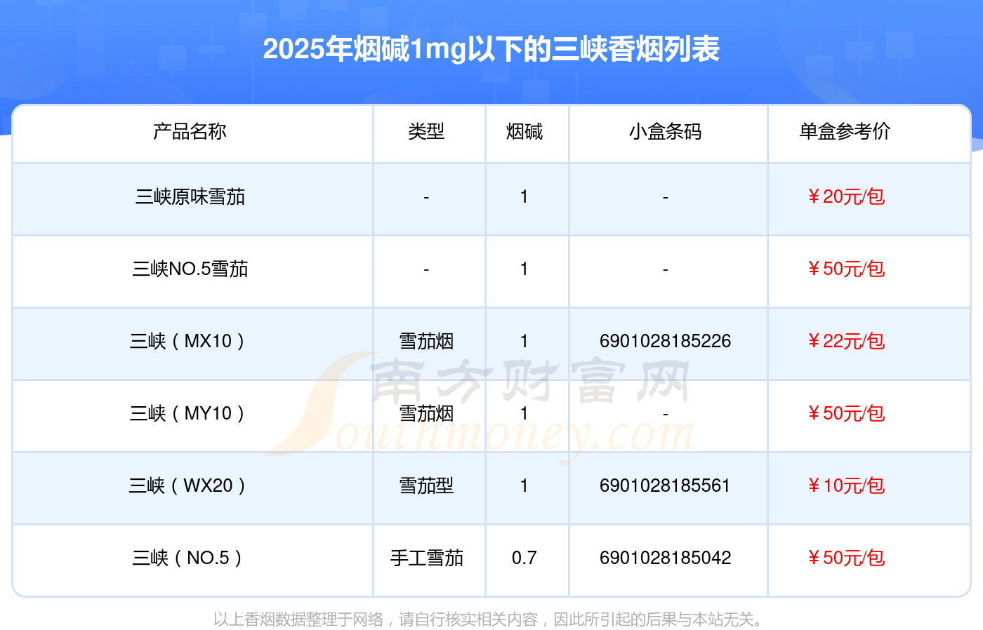 三峽香煙煙堿1mg以下的煙有三峽原味雪茄、三峽NO.5雪茄、三峽(MX10)、三峽(MY10)、三峽(WX20)、三峽(NO.5)等,具體價格如下: