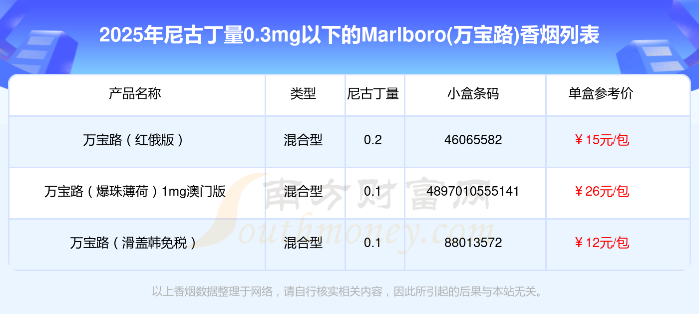 擇煙網(wǎng)為大家盤點了尼古丁量0.3mg以下的Marlboro(萬寶路)香煙,分別有萬寶路(紅俄版)、萬寶路(爆珠薄荷)1mg澳門版、萬寶路(滑蓋韓免稅)等,具體價格如下:
