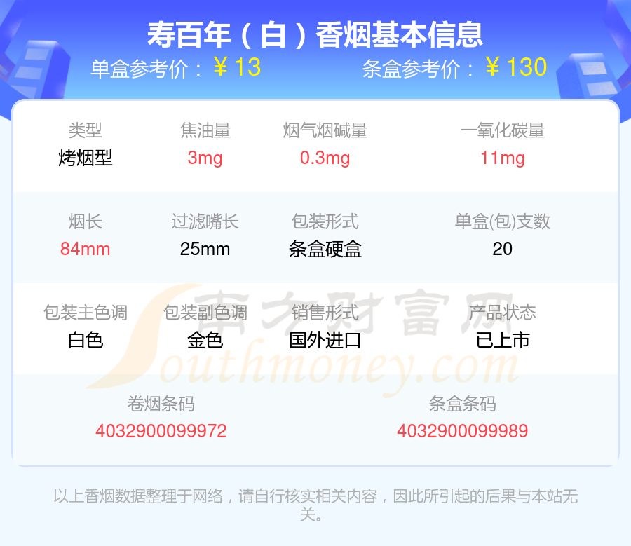SOBRANIE(壽百年)香煙焦油量3mg以下的煙分別有壽百年(白經(jīng)典)參考價(jià)15.0元/包、壽百年(倫敦白)參考價(jià)15.0元/包、壽百年(白)參考價(jià)13元/包等。