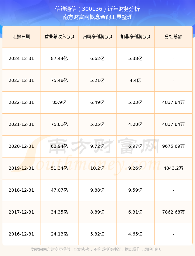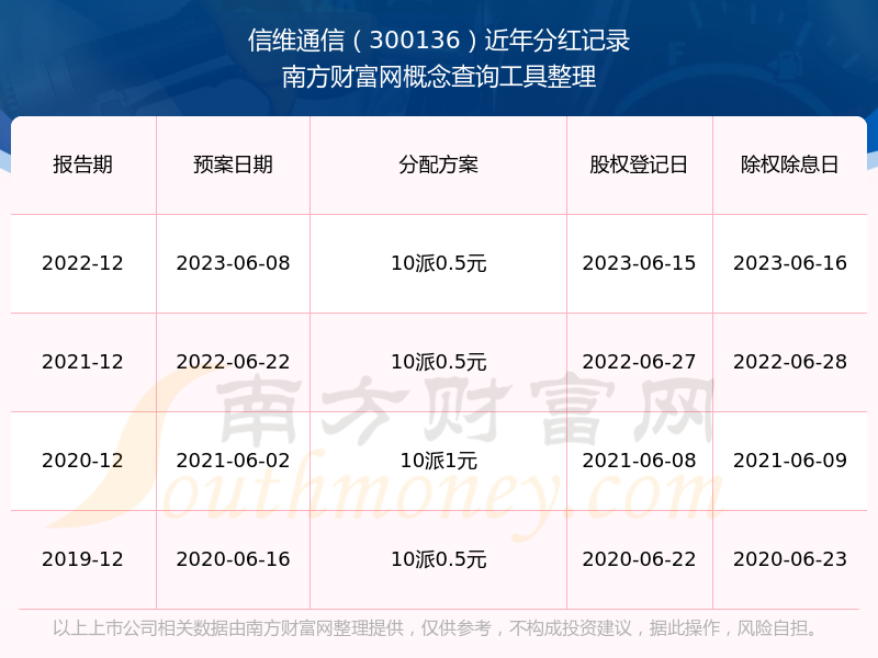 信維通信最新一次公布的分紅方案為10派0.5元。本次權益分派股權登記日為2023年6月15日,除權除息日為2023年6月16日,派息日為2023年6月16日。