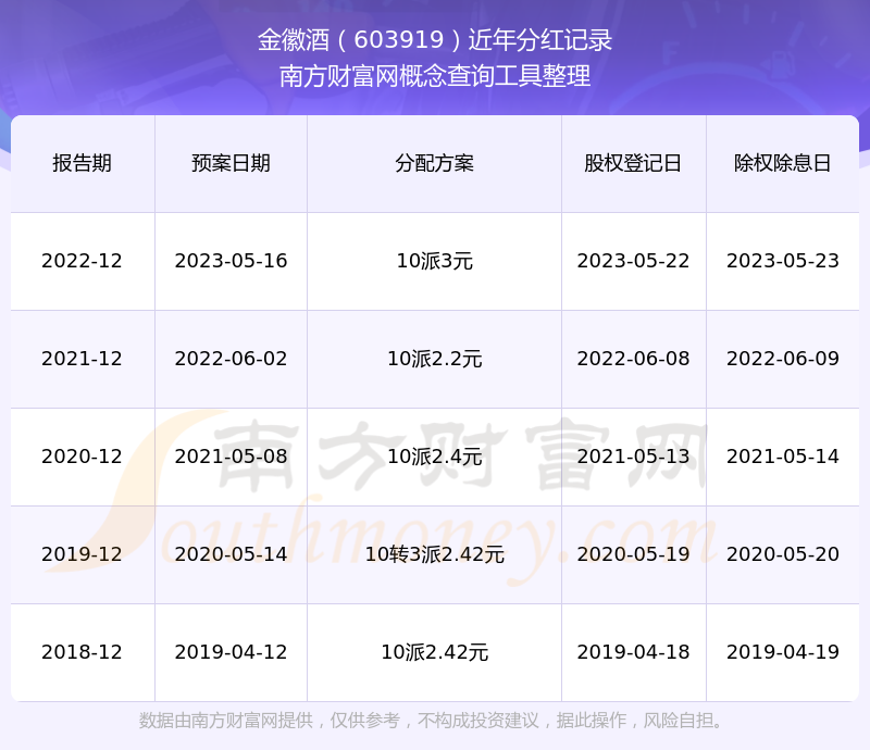 金徽酒最新一次公布的分紅方案為10派3元。本次權(quán)益分派股權(quán)登記日為2023年5月22日,除權(quán)除息日為2023年5月23日,派息日為2023年5月23日。