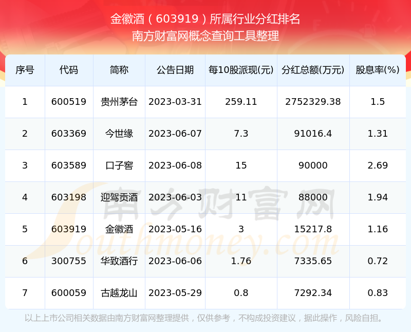 按照南方財(cái)富網(wǎng)趨勢選股系統(tǒng)統(tǒng)計(jì),金徽酒所屬行業(yè)為釀酒行業(yè)行業(yè),釀酒行業(yè)行業(yè)分紅排名情況如下表: