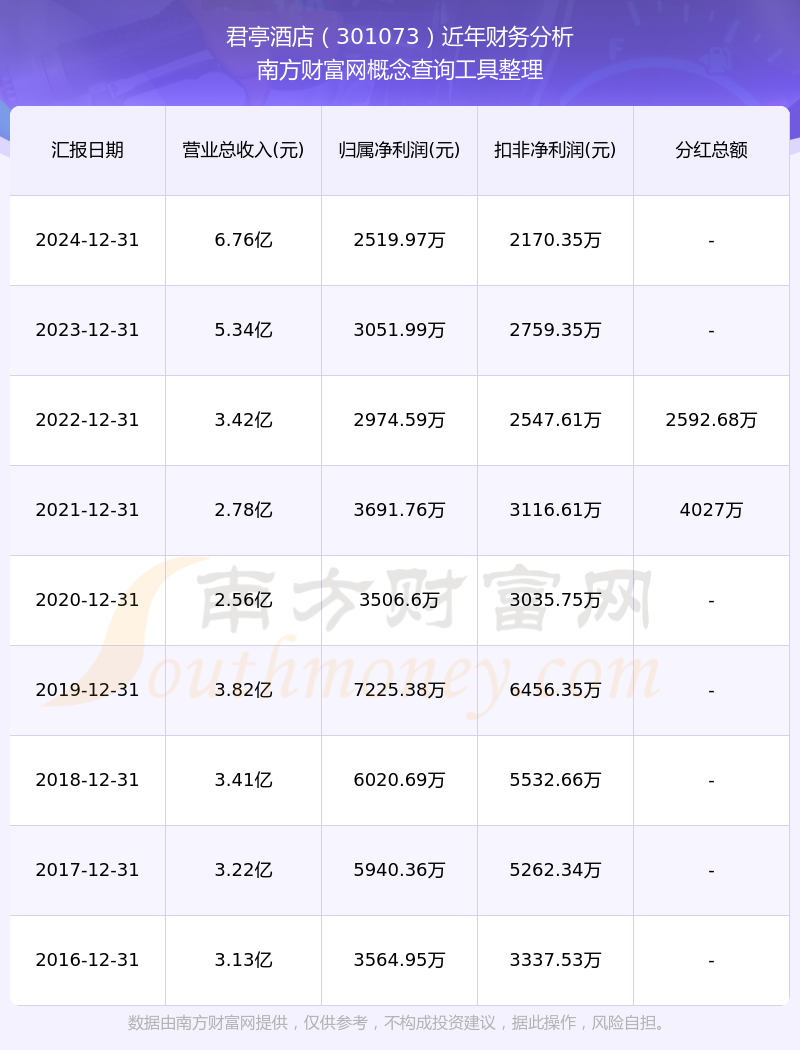 君亭酒店2024年總營收6.76億,同比增長26.57%;凈利潤2519.97萬,同比增長-17.43%;銷售毛利率32.66%。