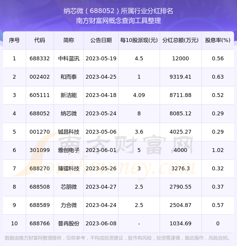 按照南方財(cái)富網(wǎng)趨勢(shì)選股系統(tǒng)統(tǒng)計(jì),納芯微所屬行業(yè)為芯片行業(yè),芯片行業(yè)分紅排名情況如下表:
