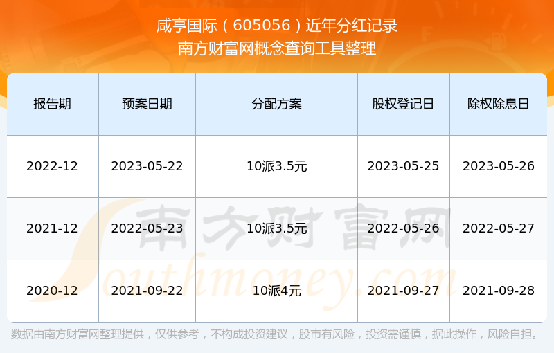 咸亨國際最新一次公布的分紅方案為10派3.5元。本次權(quán)益分派股權(quán)登記日為2023年5月25日,除權(quán)除息日為2023年5月26日,派息日為2023年5月26日。