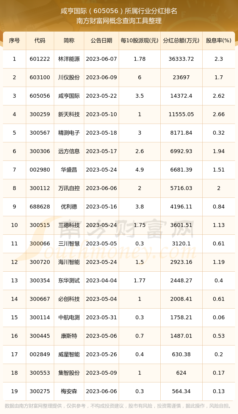 按照南方財富網(wǎng)趨勢選股系統(tǒng)統(tǒng)計,咸亨國際所屬行業(yè)為儀器儀表行業(yè),儀器儀表行業(yè)分紅排名情況如下表:
